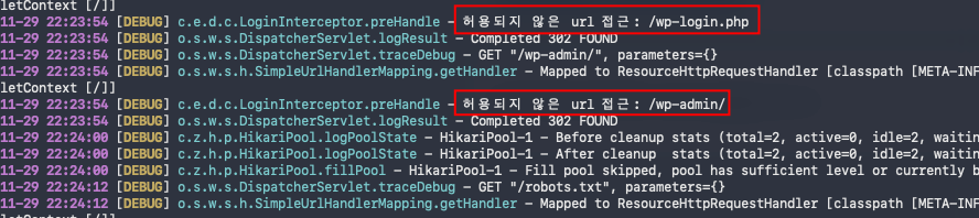 최근 운영하는 서비스인데 아래의 로그를 보면 노가다성으로 뚫고 관리자 페이지를 찾아다니는 것을 볼 수 있다.